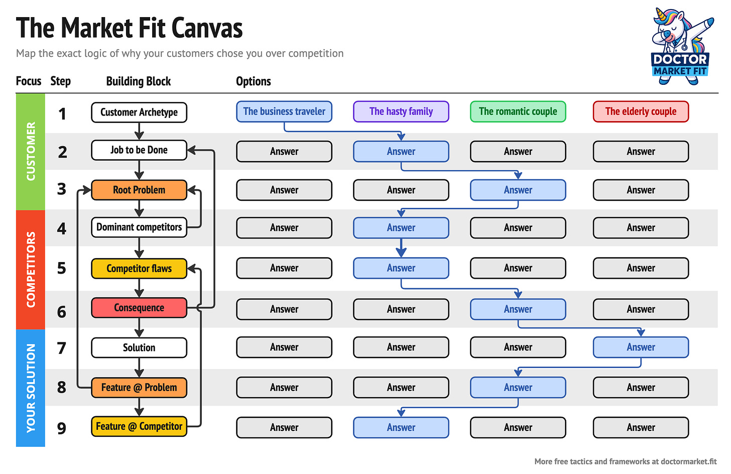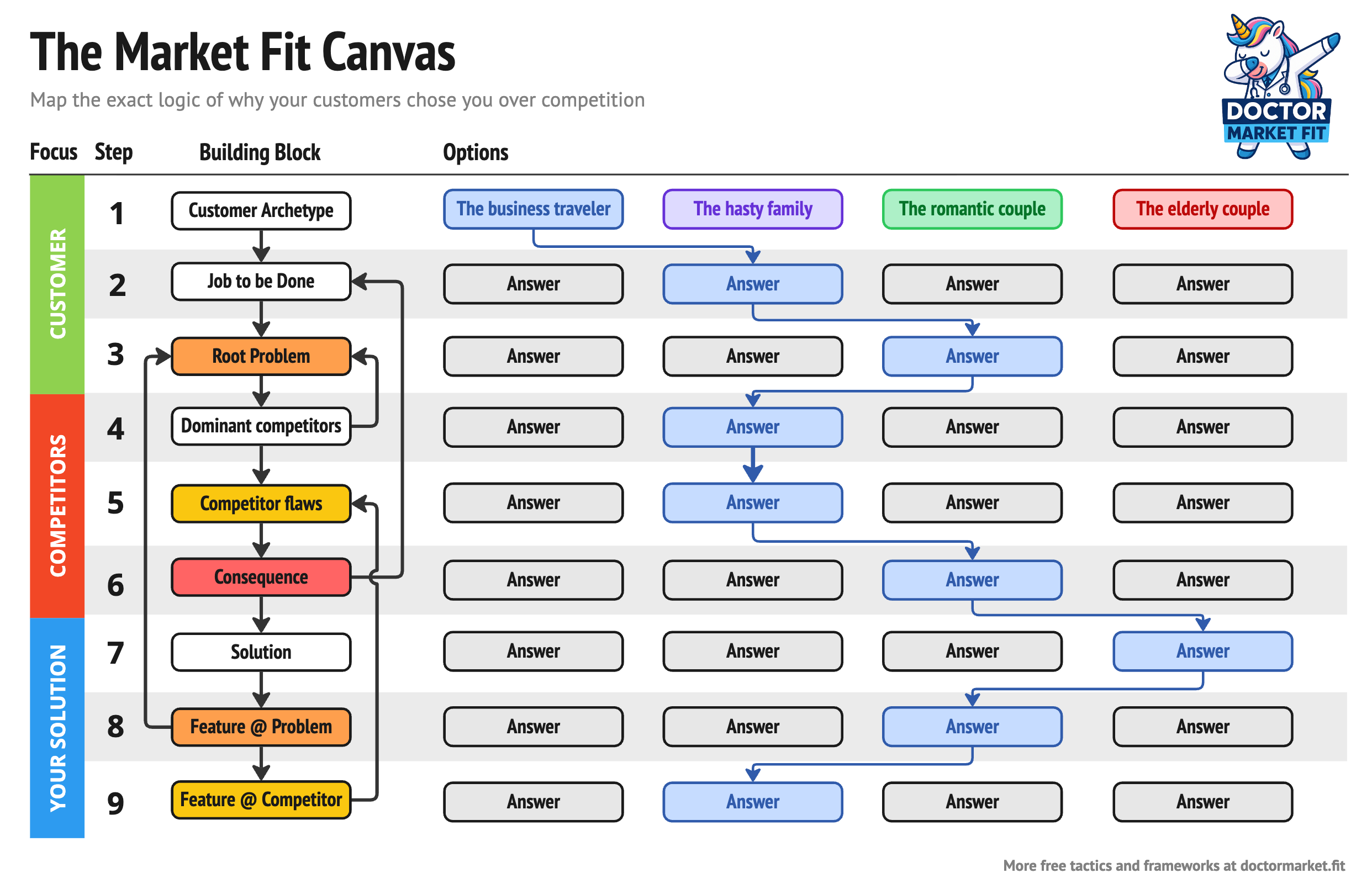 Likely, you will have multiple answers per building block. The goal is to make single narratives that fit together well. This might mean you can make 4 different stories for each customer segment.