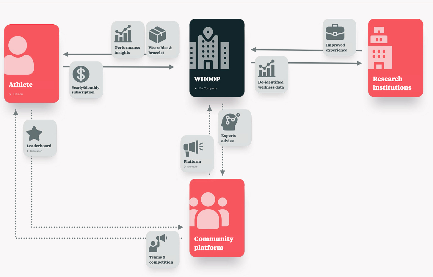 Whoop’s business model below is little more advanced as you can see. Making a business model visual like this is a great way to align your team on what the hell you are doing.