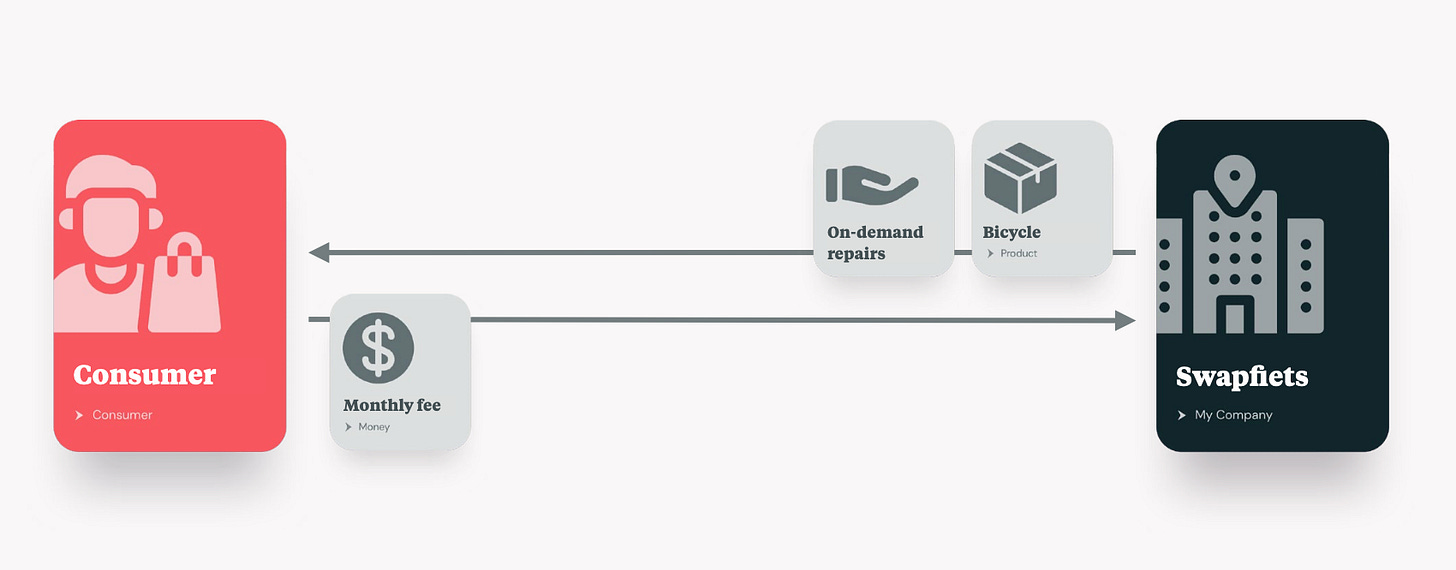 The Toolkit allows you to simply visualise the exchange of values between parties, as per the above Swapfiets example: A monthly fee gets consumers a bicycle and on-demand repairs. It’s a fairly simple business model.